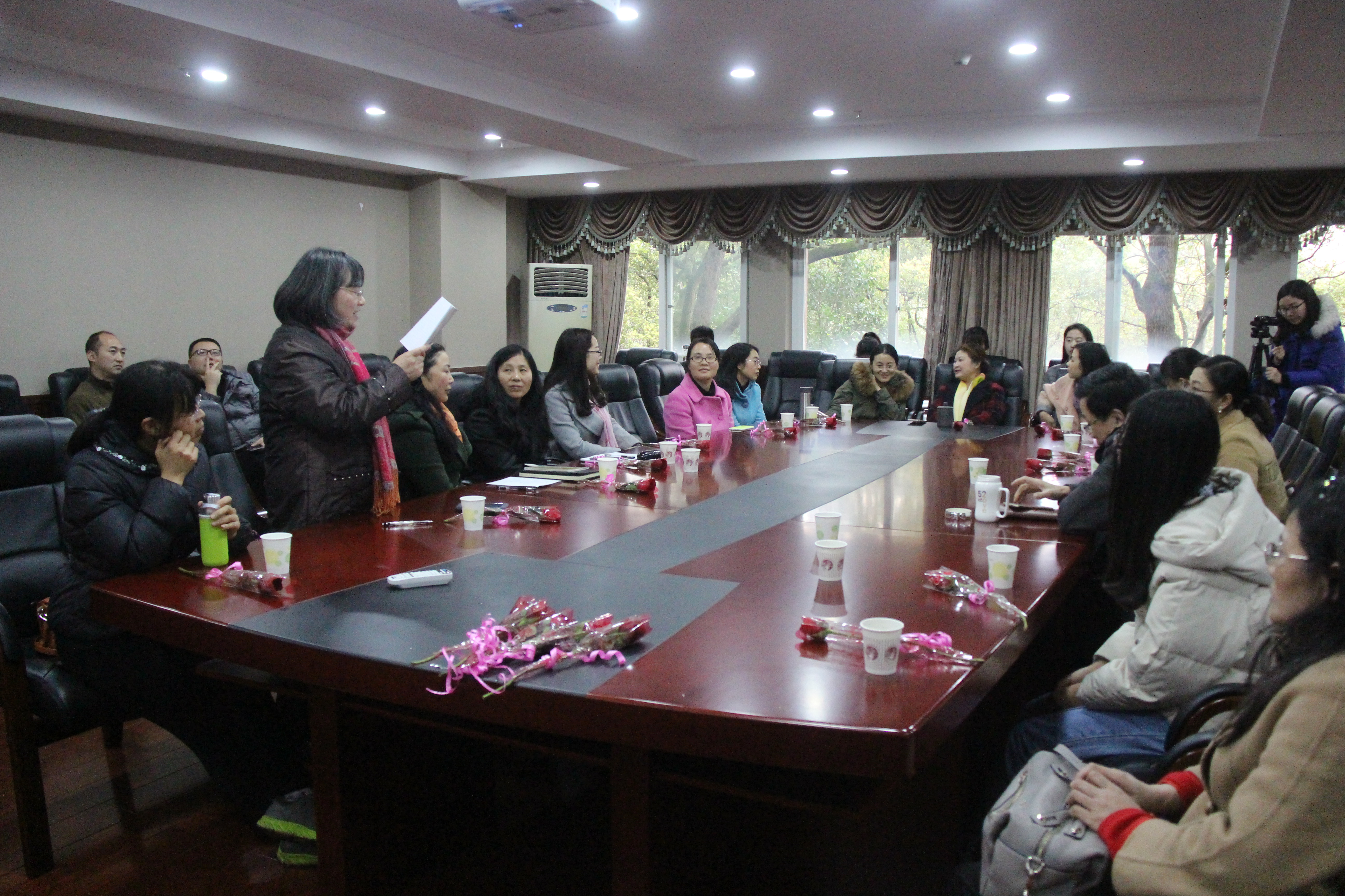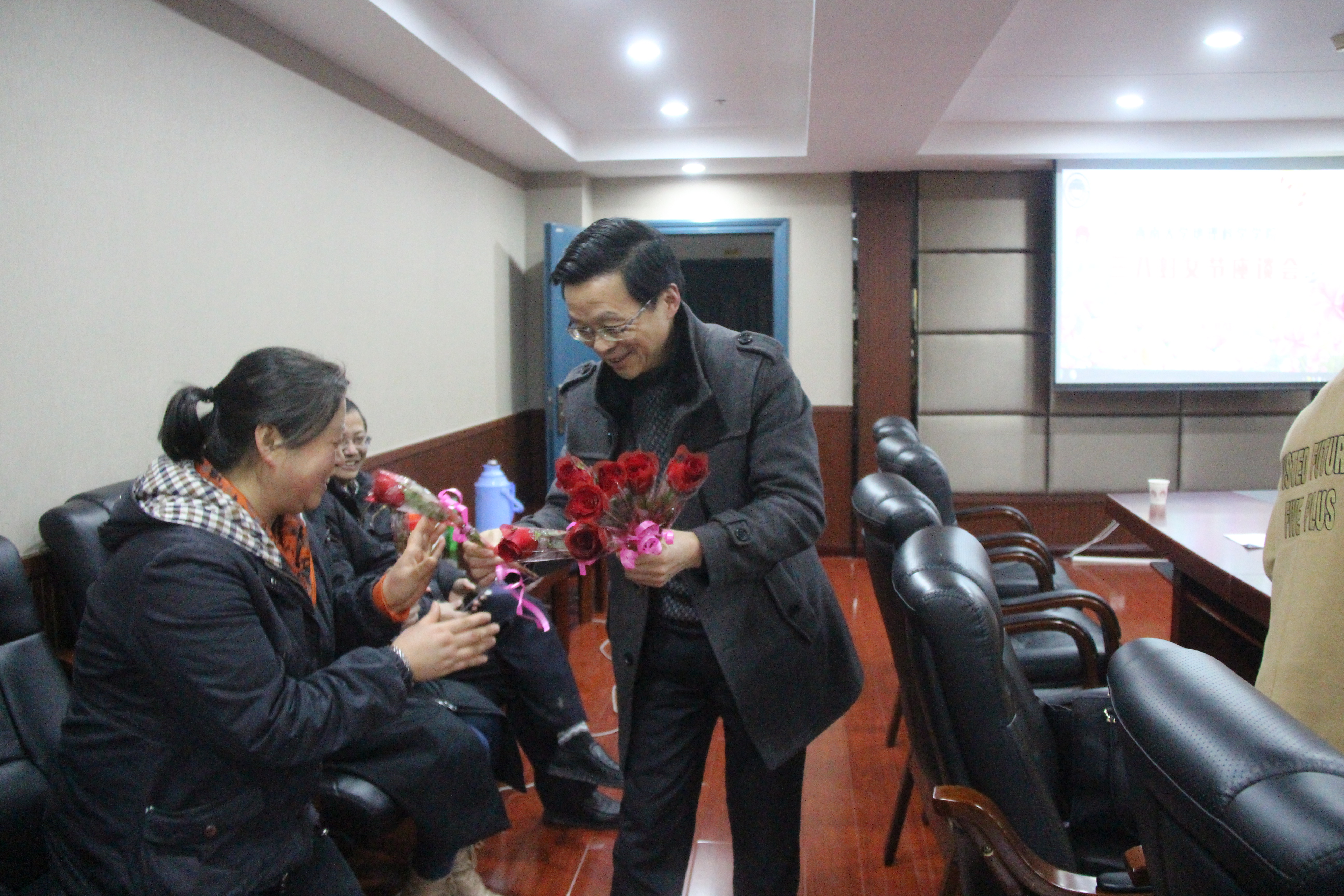 座谈会由学院工会主席刘敏老师主持。会上,喻尚其书记首先代表学院全体男同胞向女老师们致以诚挚的节日祝福。喻书记回顾了三八妇女节的由来,指出在国际上三八妇女节又被称为“国际劳动妇女节”,他讲到:“地理科学学院的发展离不开全院女同胞的辛勤劳动和付出,地科院以拥有33位优秀女教职工为荣。”随后,喻尚其书记和何凯书记代表全院男同胞们向在场每位女老师和女同学依次送上一朵玫瑰花,并祝女老师们节日快乐,身体健康,天天开心!