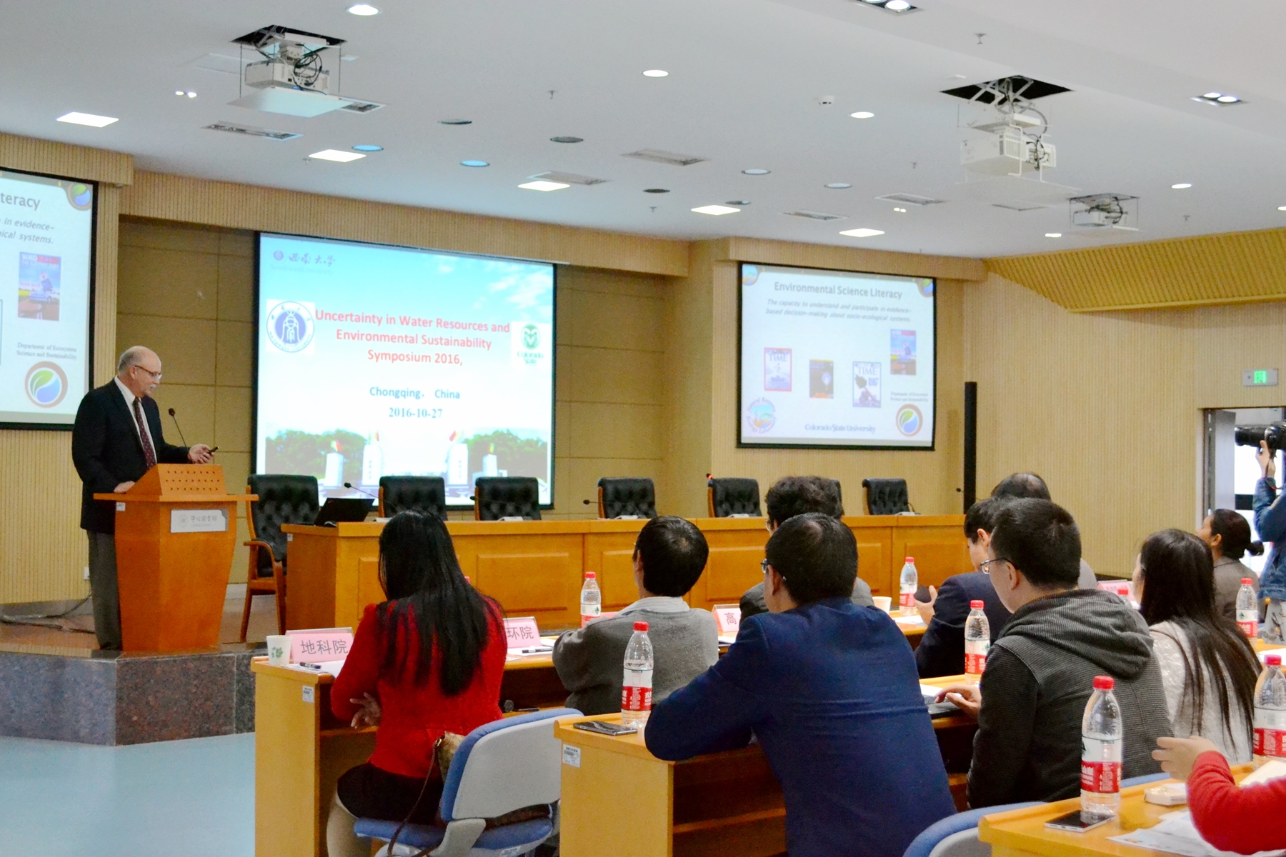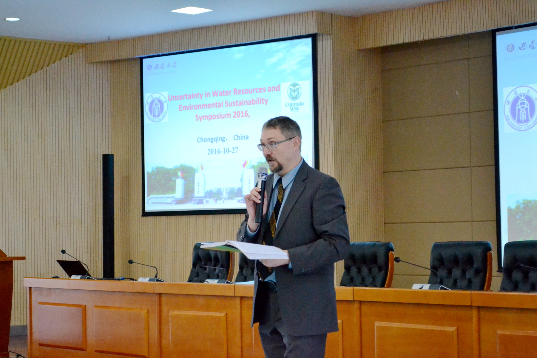 10月27日,由我院联合资源环境学院、国际交流与合作处共同举办的“2016水资源与环境可持续发展的不确定性学术研讨会”在西南大学中心图书馆15楼报告厅成功召开。来自科罗拉多州立大学、马里兰大学和我校水资源与环境领域的10余名专家、学者围绕“水资源与环境可持续发展的不确定性”主题作了10场专题报告。